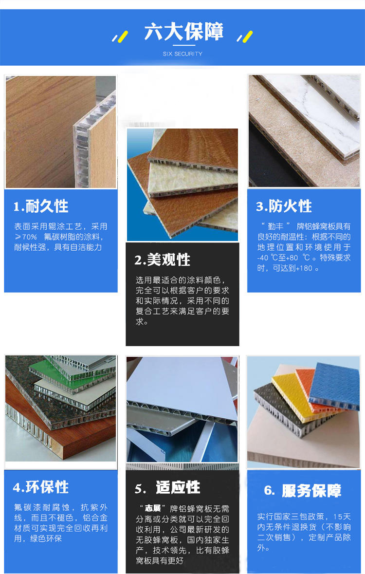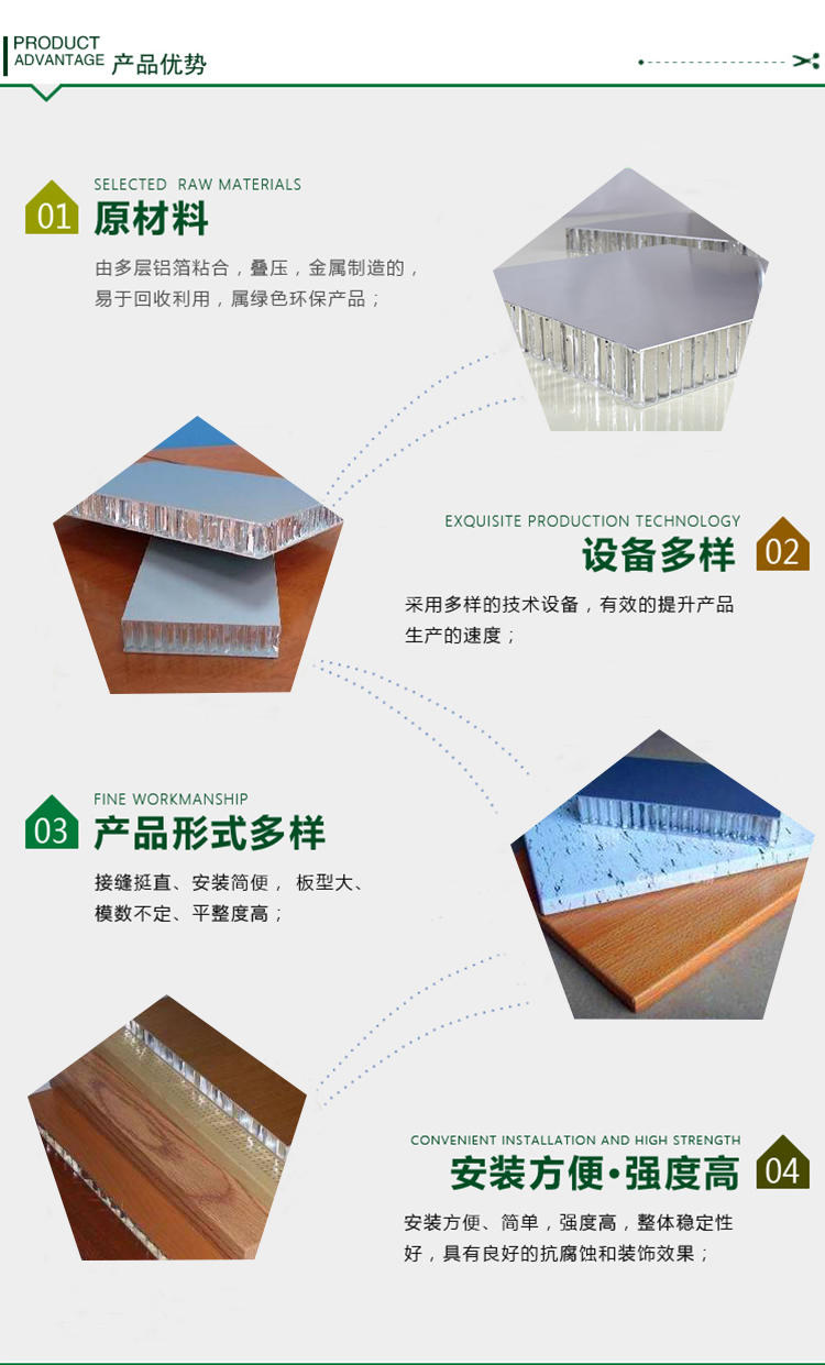 表面經(jīng)耐腐蝕力極強的氟碳樹脂處理后,使之可廣泛應(yīng)用于大廈的惟幕墻、屋頂、大型門面招牌及內(nèi)墻等的裝飾。 鋁蜂窩板正面鋁板采用符合 E. C. C. A. 質(zhì)量標(biāo)準(zhǔn)的 PVDF 氟碳烤漆,分為普通色和金屬色。因此表面同樣具有優(yōu)異的耐候性能。追隨自然產(chǎn)品的創(chuàng)新往往要模仿大自然的結(jié)構(gòu)和形式,人類的發(fā)明創(chuàng)造無不受到大自然的啟發(fā),并適應(yīng)自然界的要求。鋁蜂窩板以其質(zhì)輕、強度高、剛度大等諸多優(yōu)點,已被廣泛應(yīng)用于大廈外墻裝飾。
